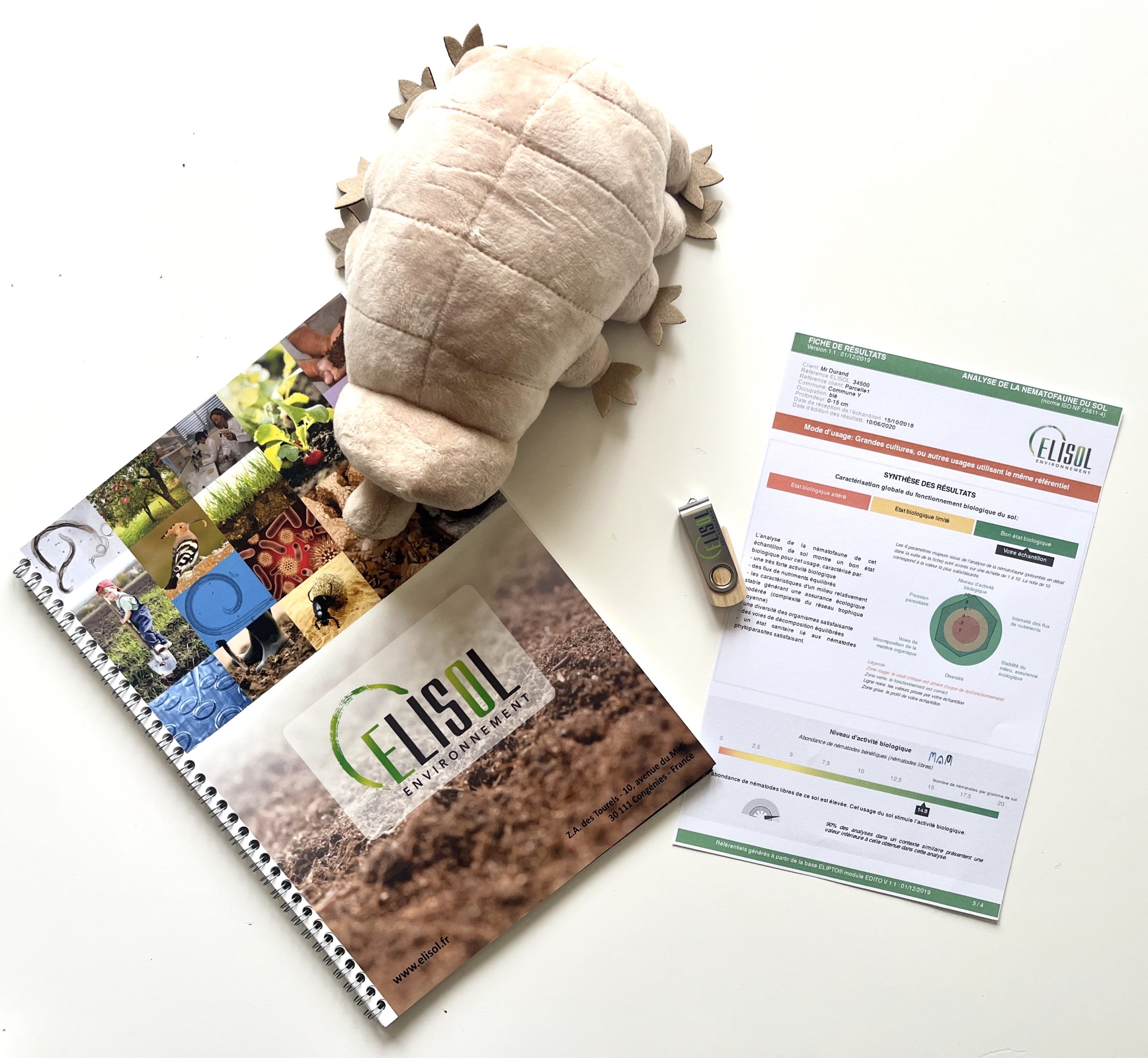 🎁 Un superbe lot de goodies (un bloc-note ELISOL, une clé USB ainsi qu’une superbe peluche de tardigrade😉) et une analyse 🔬 offerte : au choix, soit une analyse de la nématofaune soit une analyse phytonématologique!
